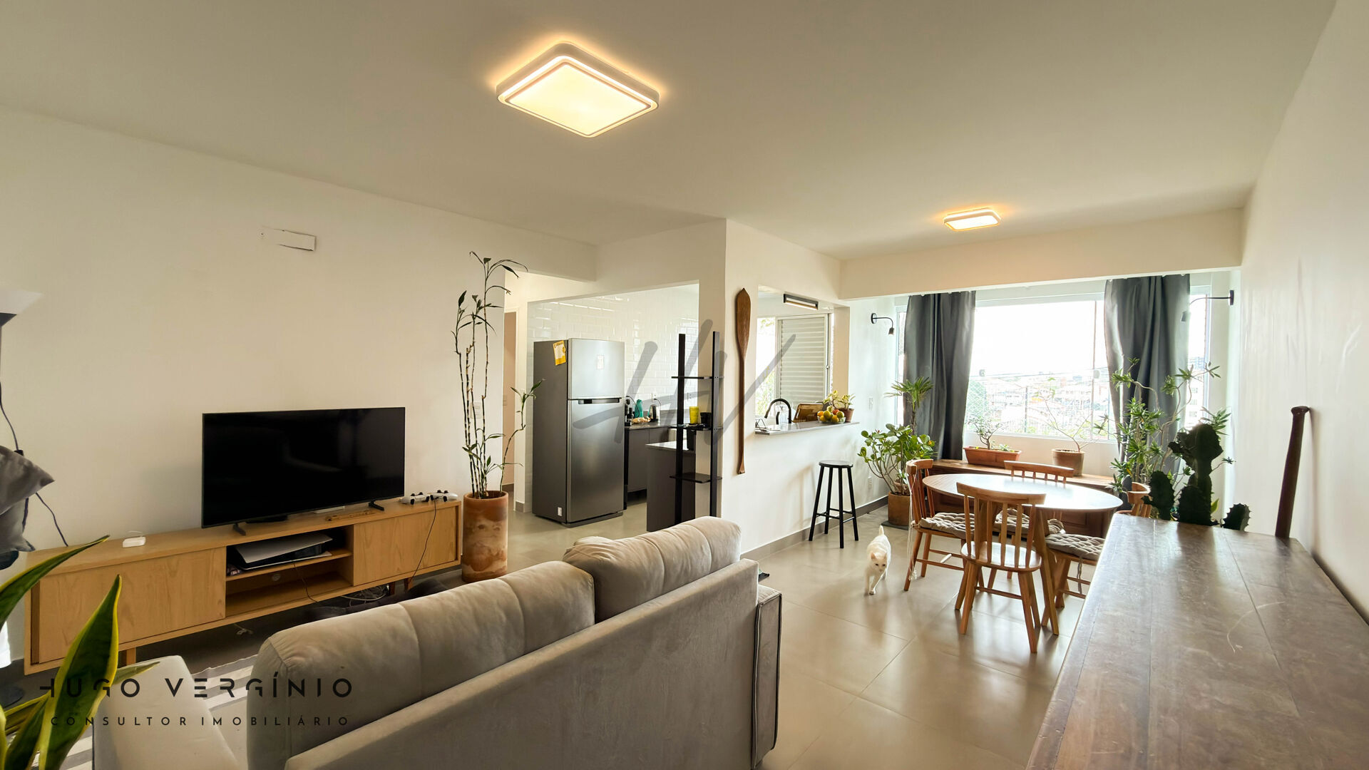 A sala integrada com a cozinha planejada cria um ambiente amplo e acolhedor, valorizado por um projeto de iluminação pensado em cada detalhe. A cozinha, equipada com uma deslumbrante pedra de quartzito natural e móveis planejados de alta qualidade, é um convite à gastronomia.